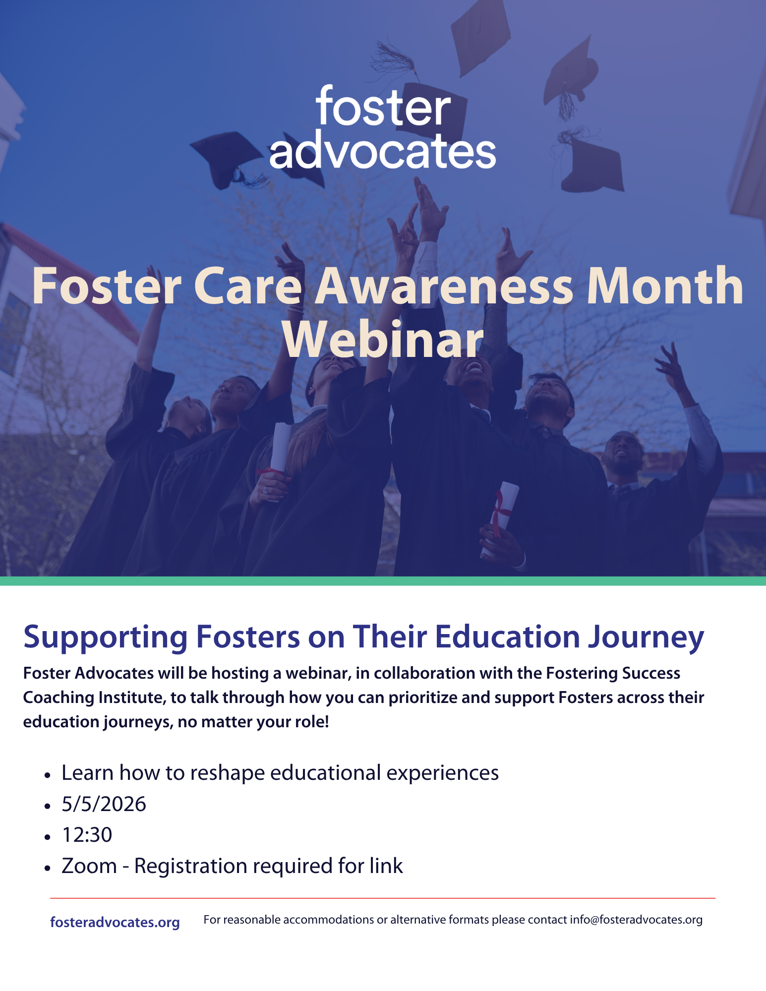 Fosters deserve support along their education journey, from K-12 to and through college. Join our virtual webinar in partnership with the Fostering Success Coaching Institute on May 5th to learn about a coaching model to support students with experience in foster care.