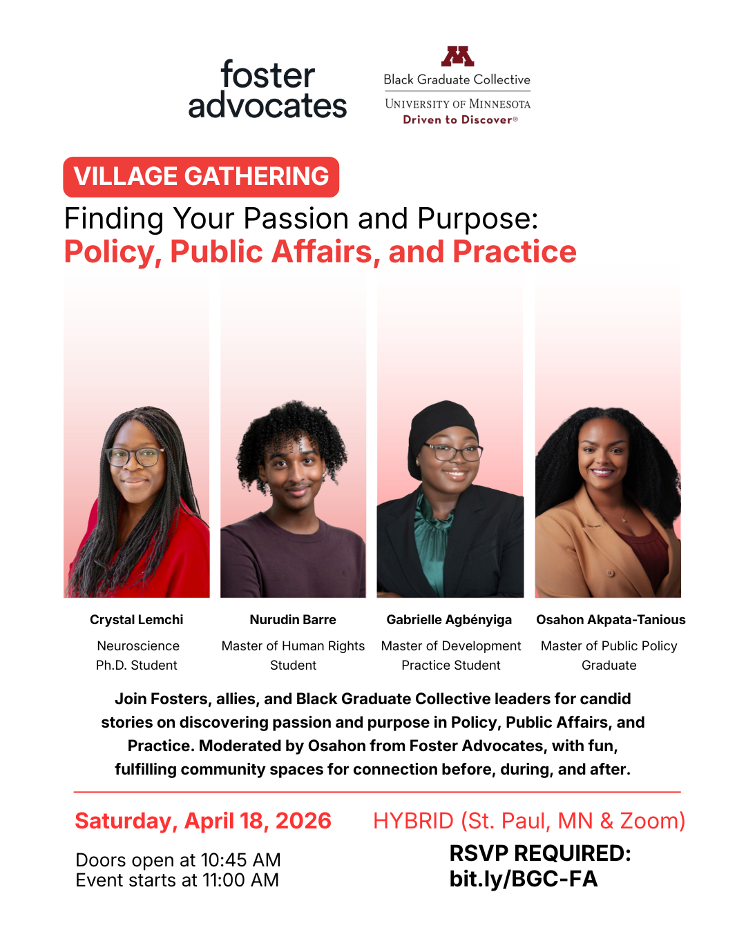 Many Fosters gravitate toward familiar roles like social work due to the supportive adults they've known. This Foster Advocates event builds your universe, exposing diverse policy and advocacy careers through real stories from University of Minnesota Black Graduate Collective leaders: Crystal Lemchi (Neuroscience PhD, medicine/policy bridge), Nurudin Barre (Human Rights MA, public affairs), and Gabrielle Agbnyiga (Development Practice MA, policy practice).